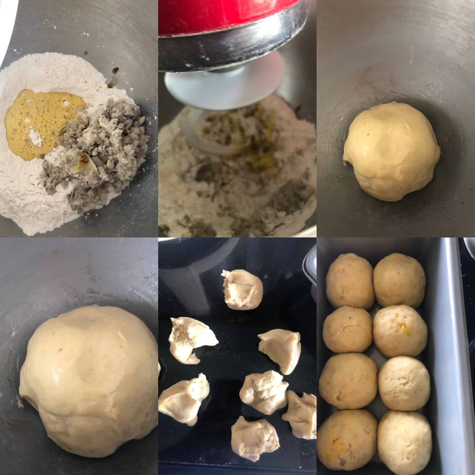 6. Pinch out 16 equal portions and roll to smooth dinner rolls and place in a greased baking pan (I used a Wilton 9X5 pan and placed only 8 rolls , you could use a flat baking tray and place all 16 rolls at one go , about 1 inch apart from each other.