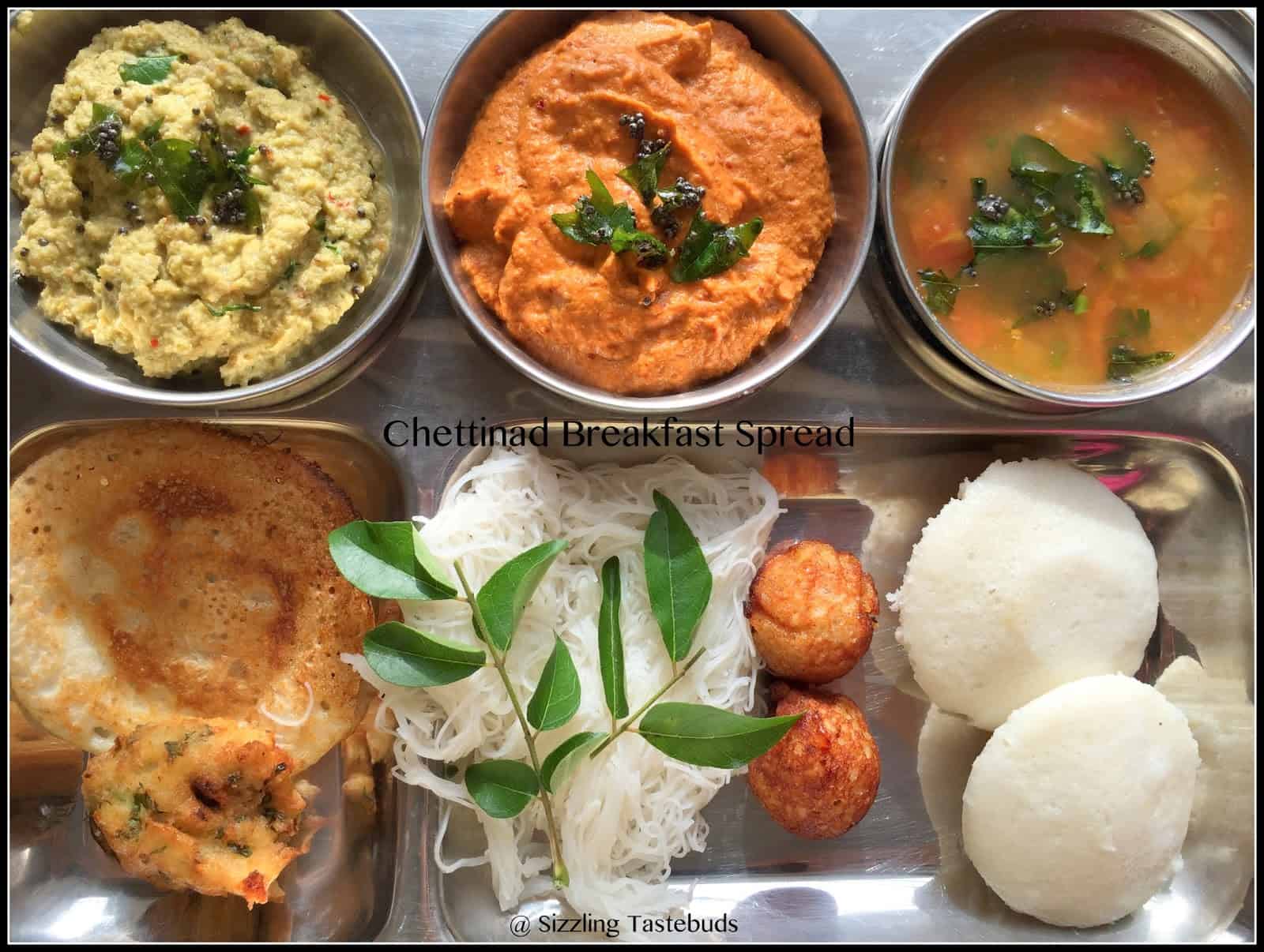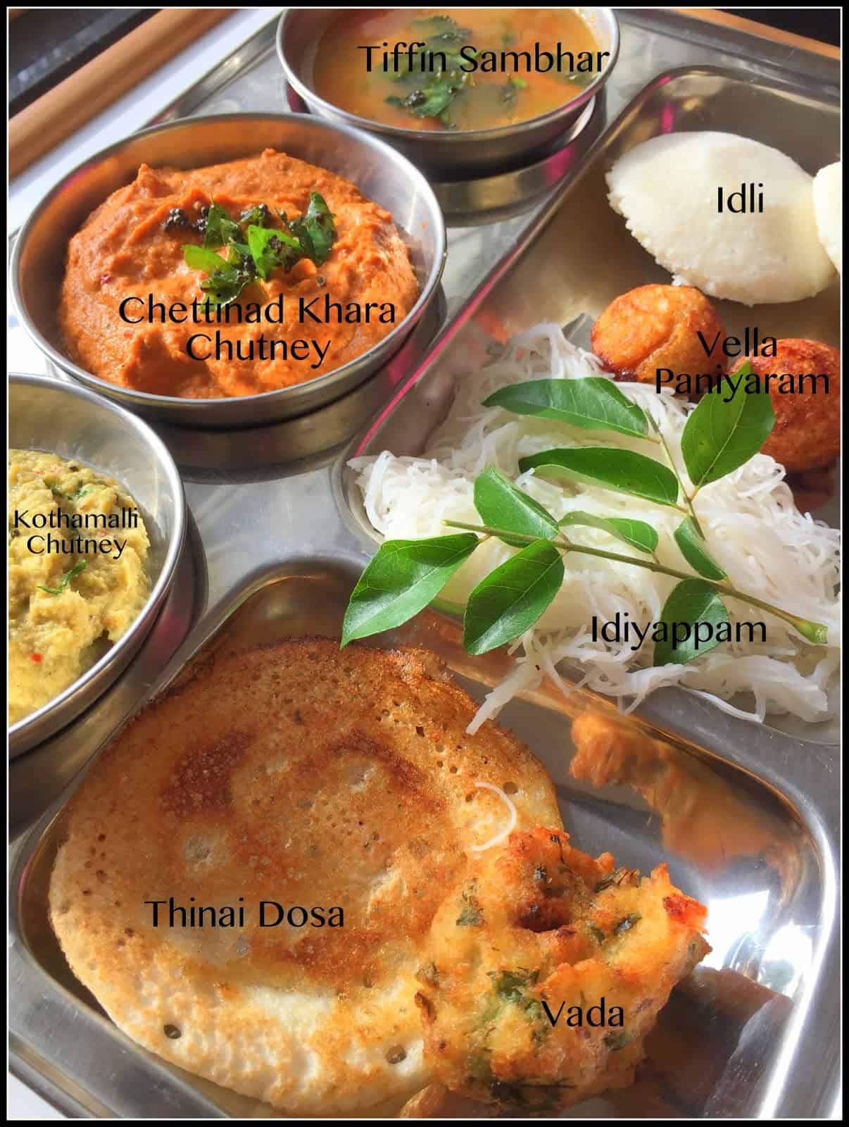 Enjoy this virtual spread with Idli, Vada, Thinai Dosa, Vella Paniyaram (sweet dumplings filled with melted jaggery), Nool puttu (or Idiyappam), Chettinad Khara Chutney, Tiffin sambhar and Kothamalli Chutney.