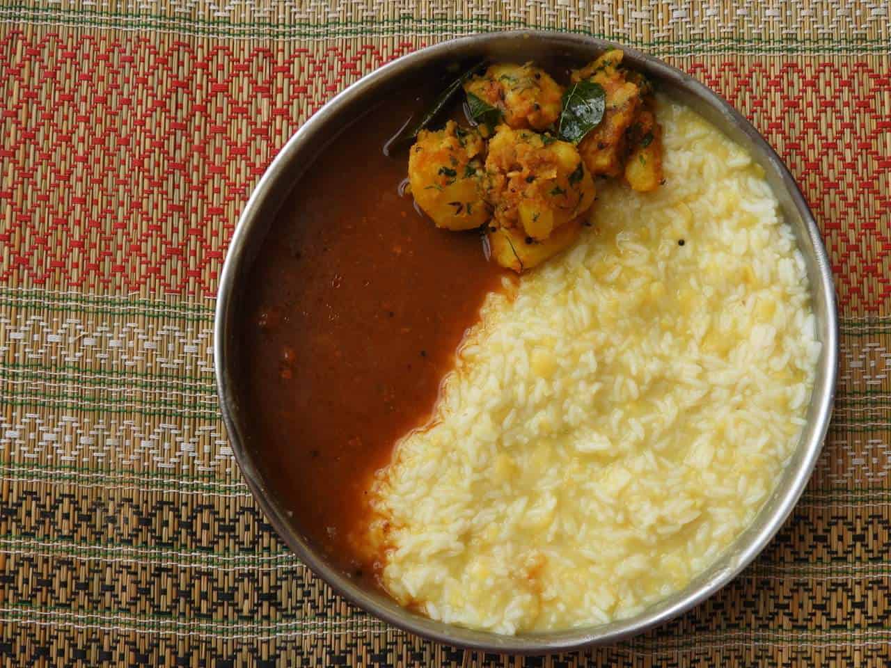 Onion Vattalkozhambu, in my opinion, is best had with hot, steamed rice with cooked toor daal mixed in, with a little salt and ghee. Best combination ever! Appa loves having it with plain parathas and potato roast. For the purpose of this guest post, I served it with toor daal rice and potato roast, making a veritable feast out of it.