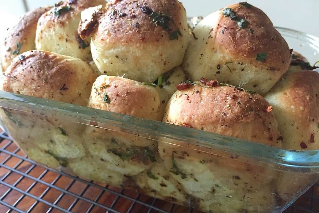 - Up in a greased bundt Pan or a deep baking dish. Cover and let them rise slightly for 45 mins. Before placing them into the oven, brush them lightly with any remaining garlic oil.