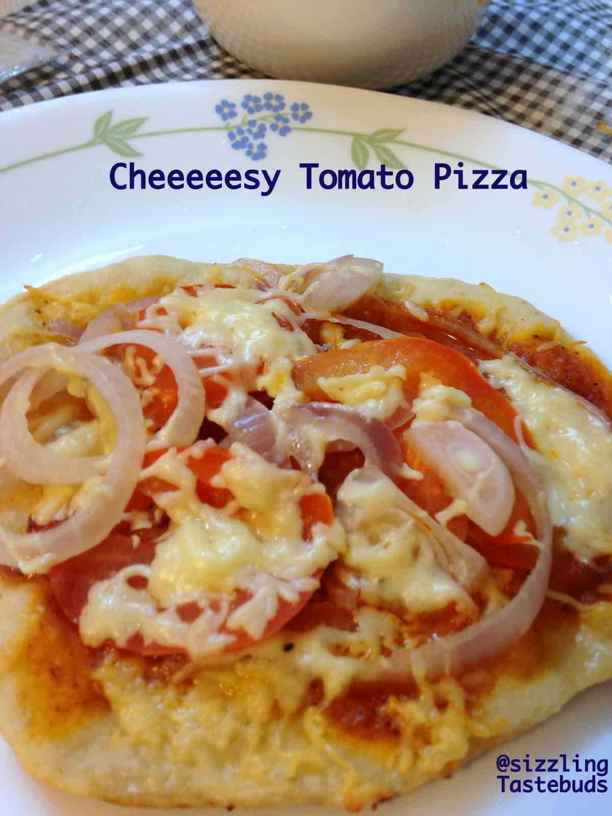 delish - that post later.The quantites and ingredients are the same as my Wholewheat Veggie Pizza with Olives and Bell peppers (except that I omitted all veggie toppings and went with just onions and tomatoes and cheese)