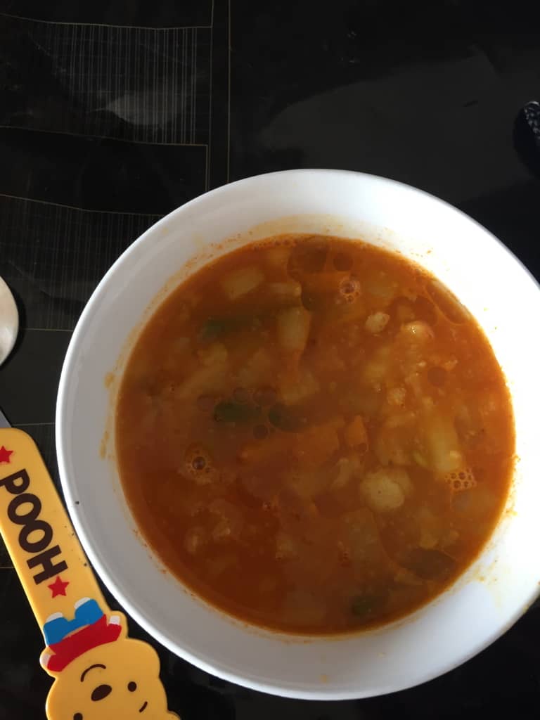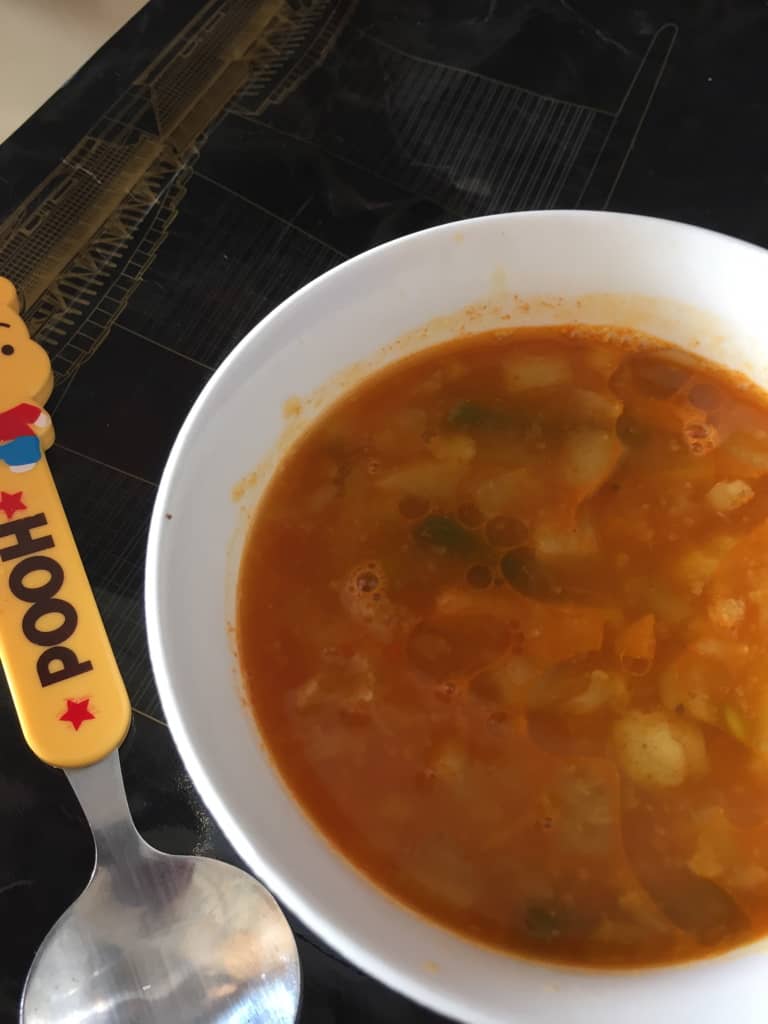 Today's Soup is somewhere in between. I personally wanted to make Zuppa Verdere (which is a vegetable rich soup) or Zuppa Tuscano (a potato-kale based thick soup), but as the little one asked for a tomato based soup, I veered right into it and made just 1 portion (and mildly spiced).